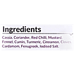 Cassia, Coriander, Red Chilli, Mustard, Fennel, Cumin, Turmeric, Cinnamon, Cloves, Cardamom, Fenugreek, Iodised Salt.