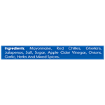 Mayonnaise, Red chillies, Gherkins, Jalapenos, Salt, Sugar, Apple Cider Vinegar, Onions, Garlic, Herbs & Mixed Spices.