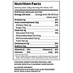 Nutrition per gram/ml: 100g Serving Size: 28g Energy: 120 Kcal Energy from fat: 26 Kcal Proteins: 1g Total Carbohydrates: 22g Dietary Fiber: 1g Sugar: 10g Total Fat: 3g Saturated Fat: 1mg Monounsaturated Fat: 1g Cholesterol: 0g Sodium: 14g Vitamin A: 0% Vitamin C: 0% Calcium: 0% Iron: 6%