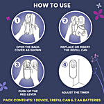 Godrej Aer Matic is a range of automatic air freshener diffusers available in four fragrances. This air freshener for a room with a flexi-control timer sprays every 10, 20, or 40 minutes, allowing you to control fragrance intensity. The air freshener automatic spray is sure to adorn your interior spaces and works perfectly, be it your living room, bedroom, or office spaces. The automatic room freshener can easily be wall-mounted with the provided mounting hole at the back or placed on a shelf with the inbuilt stand. Our battery-operated room freshener keeps your space fragrant 24x7 without any hassle. Each refill pack guarantees 2200 sprays and lasts up to 60 days (under low settings). At the end of its cycle, just replace the air freshener refill with any of our four fragrances - Violet Valley Bloom, Fresh Lush Green, Petal Crush Pink, and Cool Surf Blue.