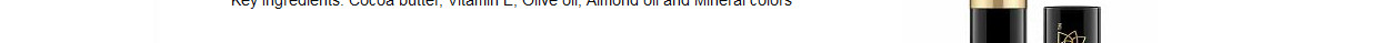 Ricinus Communis (Castor) Seed Oil, Aluminium Starch Octenyl Succinate, Polyethylene, Isopropyl Myristate, Synthetic Beeswax, Nylon 12, Triglyceride + Di Ppg 3 Myristyl Ether Adipate + Sorbitan Isosterate, Caprylic Capric Triglyceride, Ethylhexyl Methoxycinnamate, White Petroleum Jelly, Carnauba Wax, Candelilla Wax, Ozokerite Wax, Tocopheryl Acetate (vitamin E), Glyceryl Caprylate + Glyceryl Undecylenate, Olea Europaea (Olive) Oil, Prunus Amygdalus Dulcis (Sweet Almond) Oil, Cocoa Butter, Perfume, Butylated Hydroxy Toluene.
