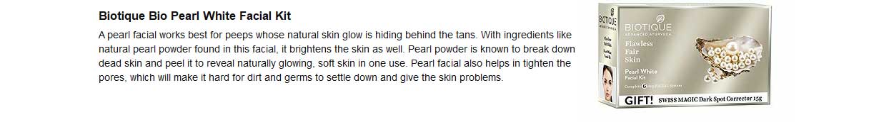 A pearl facial works best for peeps whose natural skin glow is hiding behind the tan. With ingredients like natural pearl powder found in this facial kit, it brightens the skin as well. Pearl powder is known to break down dead skin and peel it to reveal naturally glowing, soft skin in one use. Pearl facial kit also helps in tightening the pores, which will make it hard for dirt and germs to settle down and give the skin problems.