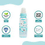 Pigeon peristaltic nipple plastic feeding bottle is a healthy start to a baby's independent eating habits. The bottle allows natural movement of the baby's tongue, ensuring maximum development of baby's facial and jaw muscles. The nipple of the bottle is stretchable and allows easy sucking and wide movement of the baby's tongue. Breast milk is the best source of nutrition for your baby, especially during baby's first year. The amount of time spent on breastfeeding also strengthens the bond between mother and baby. Pigeon bottles are made of high quality, durable polypropylene (PP) which is BPA free. The streamlined shape makes it easy for mothers to hold and keep clean. Ultra soft silicone with its double thickness ensures ideal softness and elasticity so that your baby can latch on comfortably and easily. The shape fits perfectly onto your baby's tongue, allowing smooth tongue movement and minimizing air intake. Pigeon peristaltic nipple with its Air Ventilation System helps to adjusts air pressure inside the bottle. Specially designed projections at the base and the top of the teats allow milk to flow smoothly into the baby mouth. The adjustment of the air pressure inside the bottle minimizes air intake when feeding. Hence, baby will not swallow excessive air bubbles with milk. It is BPA free, BPS free.