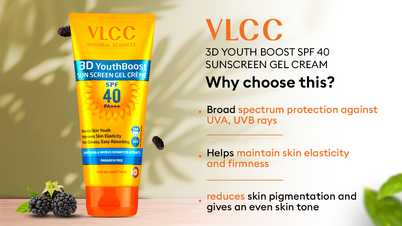 VLCC 3D Youth Boost Sunscreen Gel Creme is a broad-spectrum sunscreen that protects against the harmful effects of UVA, UVB rays, and sun damage. A complete SLS and paraben-free sunscreen, it is suitable for all skin types thanks to its unique formulation and easy absorption qualities. Enriched with Vitamin B3 and hydrating anti-oxidants, it ensures a glamorous finish by brightening the skin.