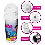 This Double Wall Insulated Stainless Steel Easy-Sip Bottle helps to keep the contents cold and fresh, also helps keeps liquids colder longer. It has no odours (unlike plastic), leak-proof and no changes in taste. It has a wide mouth opening for better cleaning. It can also accommodate ice cubes. It has a capacity of 350 ml which is ideal for young kids on the go, the plastics are BPA Free. This bottle is ideal for kids as it's durable with the interior and exterior in stainless steel to withstand daily use. As it is insulated and double-walled there is zero sweating on the outside of the bottles when filled with cold liquids. It is leak-proof, easy to use and carry - an easy to use push button lid with a pop-up straw is very comfortable for kids to use. A removable and length-adjustable strap makes it convenient for the child to carry the bottle in different places of use. The stylish designs are focused on children - specially created, original and stylish designs which are cute and fun. The product has printed in high definition colour. Fill with cold water, attach lid, let stand 5 to 10 minutes and empty. Special instructions: extra caution is strongly recommended with hot liquids as hot liquids can be dangerous for children, and ideally, you should avoid using any hot liquids for that reason.
