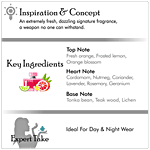 Top Note: African Orange flower, Bitter Orange and Amalfi Lemon, Middle Note: Lavender, Geranium, Nutmeg, Cardamom, Rosemary and Coriander, Base Note: Tonka Bean, Agarwood (Oud), Teak Wood, Oak Moss and Vetiver