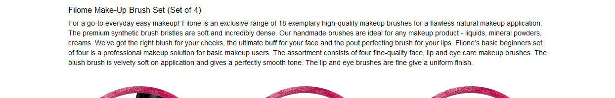 Filone is your one-stop solution to personal grooming. Our range of hair accessories and self-grooming tools are well priced and easy to use. This set contains - eyeliner brush, lip filler brush, eyeshadow brush and a blush on the brush