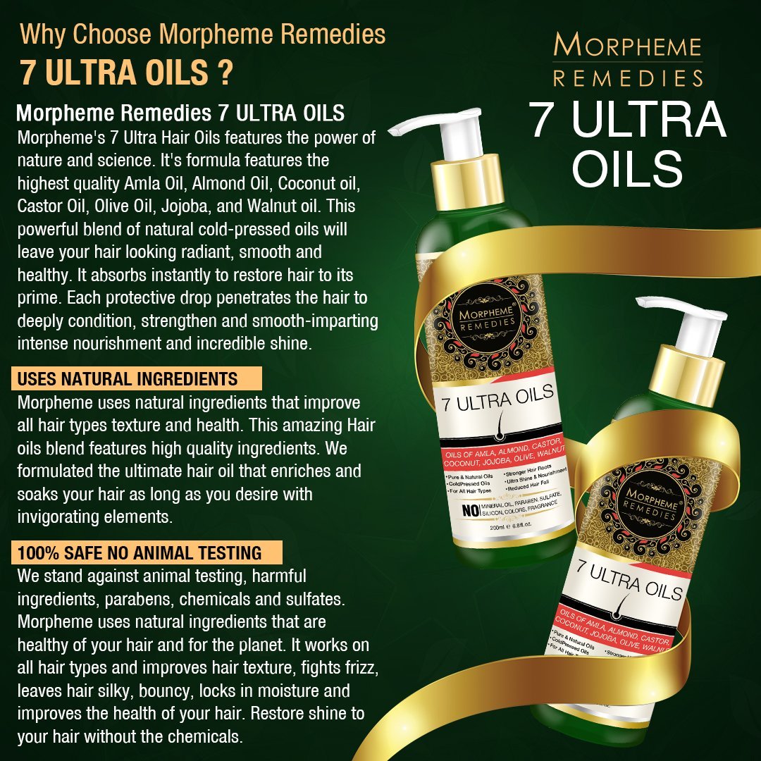 Morpheme Remedies 7 Ultra Oils contains 7 most important hair oils for hair nourishment and growth. 100% Natural. It contains no paraben, no silicon, no sulphate, no mineral oil, no chemicals and no preservatives. It strengthens the hair.