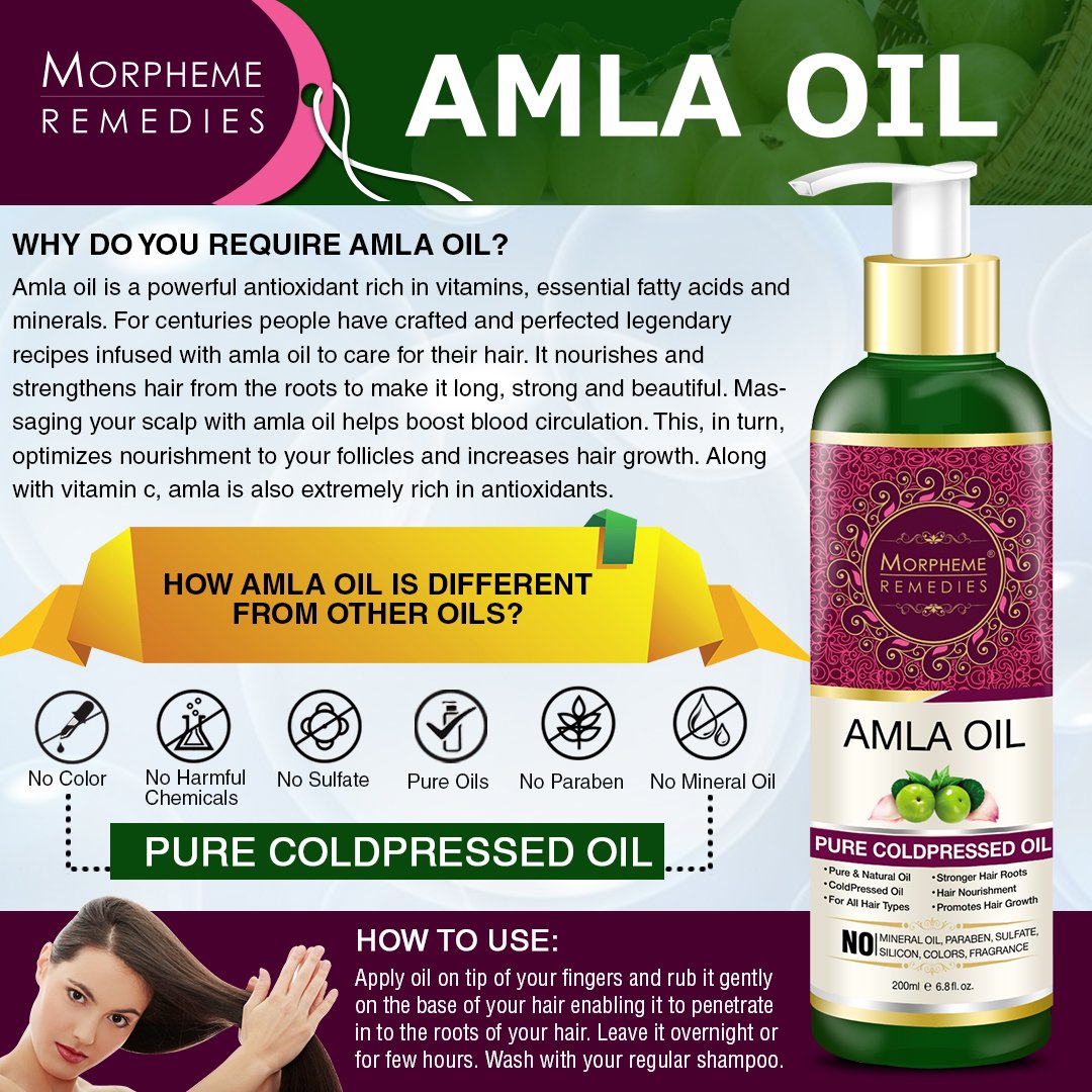 Amla Oil is a powerful antioxidant rich in vitamins, essential fatty acids, and minerals. For centuries people have crafted and perfected legendary recipes infused with Amla Oil to care for their hair. It nourishes and strengthens hair from the roots to make it long, strong and beautiful. Massaging your scalp with amla oil helps boost blood circulation. This, in turn, optimises nourishment to your follicles and increases hair growth. Along with Vitamin C, Amla is also extremely rich in antioxidants. Antioxidants help keep hair and follicles healthy by fighting off the damage-causing free radicals. Regularly using amla for hair care also helps strengthen the hair shafts, preventing issues such as breakage and split-ends. There is no mineral oil, paraben, sulphate, silicon, colours, and fragrance added.