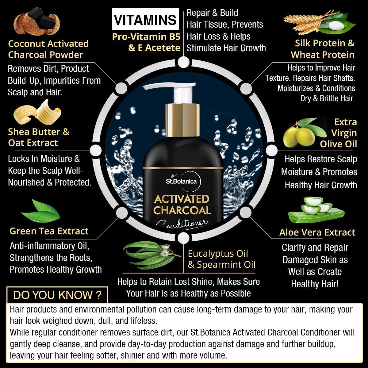 With st botanica activated charcoal conditioner, soothe strands from root to tip with the power of bio active blends and notes of eucalyptus & spearmint. Watch natural volume and magnetic shine return as this conditioner nourishes to leave nothing but refreshed flawless hair. Charcoal naturally detoxifies, re-energizes, renews and restores hair by removing impurities for a longer-lasting clean and natural volume. Experience the difference of this renewing cream rinse with a pro Vitamin B5, E and wheat, and oats protein. the purifying conditioner nourishes hair while removing dirt and impurities, leaving hair with a fully refreshed and renewed look. Many hair care products leave your hair feeling dry and brittle. Our moisture-rich formula removes dirt and fortifies it with hydration.