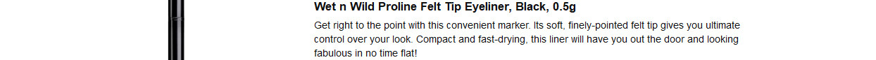 Get right to the point with this convenient marker by Wet n Wild that goes by the name Proline Felt Tip Liner. Its soft, finely-pointed felt tip gives you ultimate control over your look, whether wild wings or subtle tighlining. Compact and fast-drying, this liner will have you out the door and looking fabulous in no time flat. It is smudge-free, long-wearing and is the fast-drying formula. It settles to a matte finish.