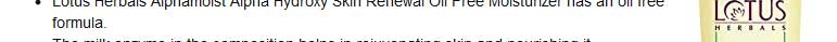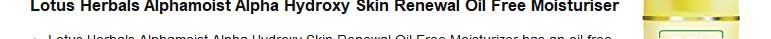 • Lotus Herbals Alphamoist Alpha Hydroxy Skin Renewal Oil Free Moisturizer has an oil free formula.