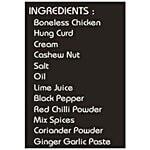 • Chicken, Hung Curd, Lime Juice, Ginger Garlic Paste, Food Colour, Tandoori Masala, Red Chilli Powder, Coriander Powder, Turmeric Powder, Mustard Oil, Salt, Cumin Powder, Garam Masala.