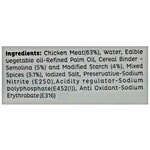 Chicken Meat(63%), Water, Edible Vegetable Oil-Refined Palm Oil, Cereal Binder - Semolina (5%) And Modified Starch (4%), Mixed Spices (3.1%), Iodized Salt, Preservative-Sodium Nitrite (E250), Acidity Regulator-Sodium Polyphosphate (E452(I)), Anti Oxidant-Sodium Erythrobate (E316)