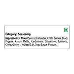 Mixed Spices (Coriander, Chilli, Cumin, Black Pepper, Kasuri Methi, Cardamom, Cinnamon, Turmeric, Clove, Ginger), Iodized Salt, Soya Sauce Powder.