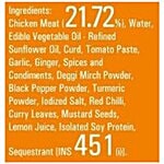 Chicken Meat (21.72%), Water, Edible Vegetable Oil, Refined Sunflower Oil, Curd, Tomato Paste, Garlic, Ginger, Spices & Condiments, Deggi Mirch Powder, Black Pepper Powder, Turmeric Powder, Iodized Salt, Red Chilli, Curry Leaves, Mustard Seeds, Lemon Juice, Isolated Soy Protein, Sequestrant (INS 451)