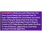 Whole Grains 58%(Rolled Oats, Brown Rice Flakes, Quinoa Flakes), Seeds & Nuts 14%(Pumpkin, Almonds, Chia, Flax), Dried Fruits 11%(Cranberry, Raisins), Dark Chocolate (Cocoa, Cocoa Butter, Sugar, Soy Lecithin), Dates Syrup, Himalayan Pink Salt, Jaggery, Rice Bran Oil, Cocoa Powder
