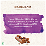 Sugar, Milk Solids (19.5%), Cocoa Butter, Cocoa Solids, Raisins (6.6%), Almonds (5.6%), Hazelnuts (5.6%) & Emulsifiers (322(I)).
