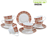 BP Bharat Chai/Tea Cup Bonechina & Saucer - White With Maroon & Orange Ethnic Print Border, 160 ml (Set of 12)