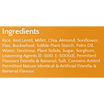 Rice, Red Lentil, Millet, Chia, Almond, Sunflower, Flax, Buckwheat, Edible Plant Starch, Palm Oil ,Water, Dextrose, Plant Solids, Sugar, Sorghum, Leavening Agents [E-500, E-500(ii)], Permitted Flavours (Vanilla & Banana), Salt. Contains Added Permitted Nature Identical & Artificial (Vanilla & Banana) Flavour.