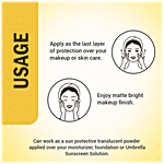 Umbrella Sunscreen Powder SPF 50 is a powder-based broad-spectrum sunscreen covering both Ultraviolet A & B radiations both cause severe damage & diseases. Therefore, regular use of Umbrella Sunscreen Powder SPF 50 gives you long term protection from suntan, sunburn, sun allergy, premature ageing and even skin cancer. Further, Umbrella Sunscreen Powder SPF 50 seals the open pores of the skin surface and brings instant liveliness and glow to the skin.