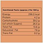 Nutrition per gram/ml: 100g Energy: 296.0 kcal Protein: 4.2 g Carbohydrate: 39.2 g Sugars: 26.5 g Total Fat: 13.6 g Saturated Fat: 7.8 g Trans Fat: 0.2 g
