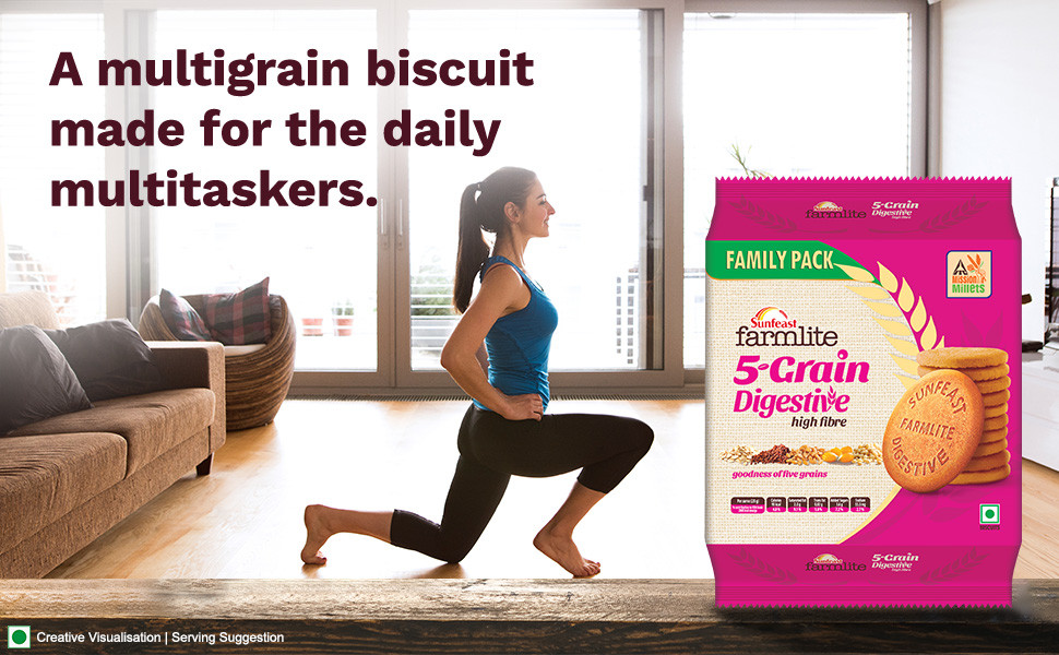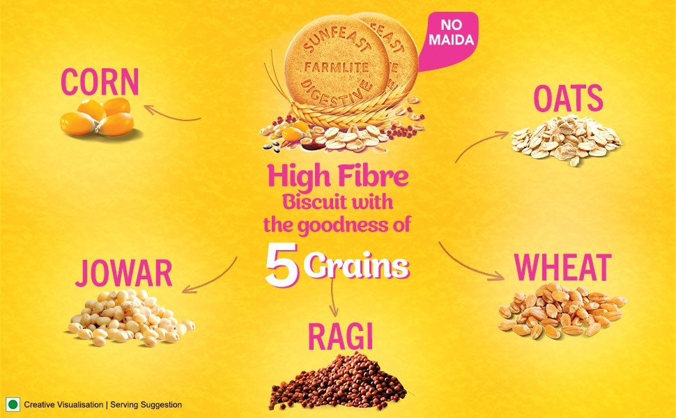 A tasty way to power through the day. The Sunfeast Farmlite Digestive Biscuit is a high-fibre biscuit, made with the goodness of five grains: ragi, oats, jowar, corn & wheat. These 5 super grains will keep you energised to live a multitasking life. Rich in fibre, Sunfeast Farmlite 5 Grain Digestive Biscuit is not just any digestive, it's DiZESTive and helps you stay active to complete all your day's tasks. Made with the best quality ingredients that are sourced from farms across India. These biscuit cookies are baked to a perfect golden-brown crunch and taste great. Pair it with your tea and you are in for a treat. So, add this delicious biscuit to your tea-time routine and take a bite of some crunchy goodness every day.