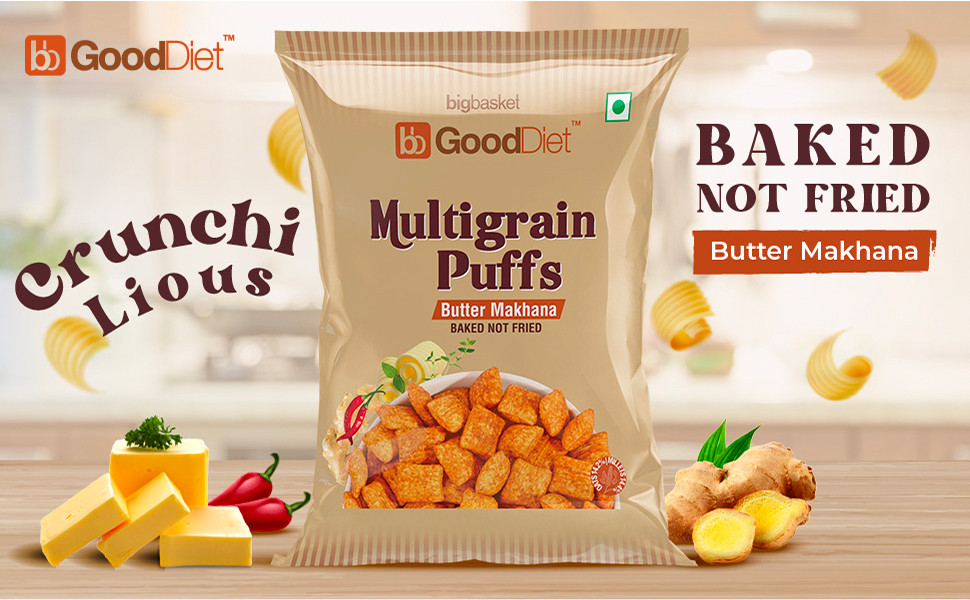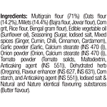 Multi-Grain Flour (71%) (oats Flour, Bajra Flour, Jowar Flour, Corn Grit, Rice Flour, Bengal Gram Flour), Edible Vegetable Oil (sunflower Oil), Seasoning (sugar, Edible Common Salt, Garlic, Onion Powder, Spice & Condiments (ginger, Cumin, Chilli), Dehydrated Herb, Flavour Enhancer (ins 627 , Ins 631) And Anticaking Agent) & Edible Common Salt. Alergen Declaration: Contains Milk Solid. Packed In A Facility Which Handles Wheat, Soya & Nuts. Contains Added Flavours. (Nature Identical Flavouring Substances (butter)).