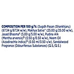 PER 100 g/%: Dugdh Pasan (Shankhjaru) (67.34 g/6734 w/w), Makhya Satva" (25.00 g/25.00 w/w), Jasad Bhasmax (5.00 g/5.00 w/w), Pudina Ark (Mentha arvensis)$ (0.50 g/ 0.50 w/w), Neem Oil (Azadirachta indica)$ (0.50 m1/0.50 v/w), Sandalwood Fragrance (Odouriferous Substances) (0.S./0.S.)