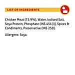 Chicken (75.9%), Water, Iodised Salt, Soy Protein, Phosphate (INS 451(i)), Spices & Condiments, Preservative (INS 250). Allergens: Soy.