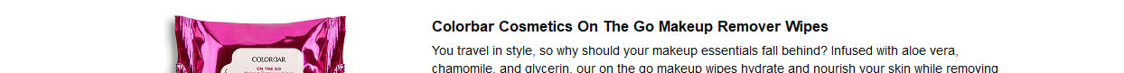 You travel in style, so why should your makeup essentials fall behind? Infused with aloe vera, chamomile, and glycerin, our on-the-go makeup wipes hydrate and nourish your skin while removing all traces of dirt, grime, and makeup even the extra-stubborn, smudge proof, and waterproof kind. Formulated as hypoallergenic and suitable for all skin types.