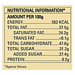 Nutrition per gram/ml: 100g Energy: 562 KCAL Total Fat: 37.5g Saturated Fat: 24.2g Trans Fat: <0.1g Total Carbohydrate: 47.6g Total Sugar: 31.2g Added Sugar: 27.4g Protein: 9.2g