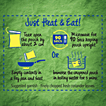 Tear open the pouch by about 2 cm where indicated. Heat in microwave for 90 seconds keeping pouch upright. Empty contents in a frying pan and heat or immerse the unopened pouch in boiling water for 5 mins.