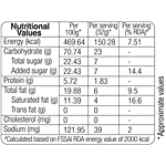 Nutrition per gram/ml: 100g Serving Size: 32g Energy (kcal): 469.64 Carbohydrate (g): 70.74 Total sugar (g): 22.43 Added sugar (g): 22.43 Protein (g): 5.72 Total fat (g): 19.88 Saturated fat (g): 11.39 Trans fat (g): 0 Cholesterol (mg): 0 Sodium (mg): 121.95