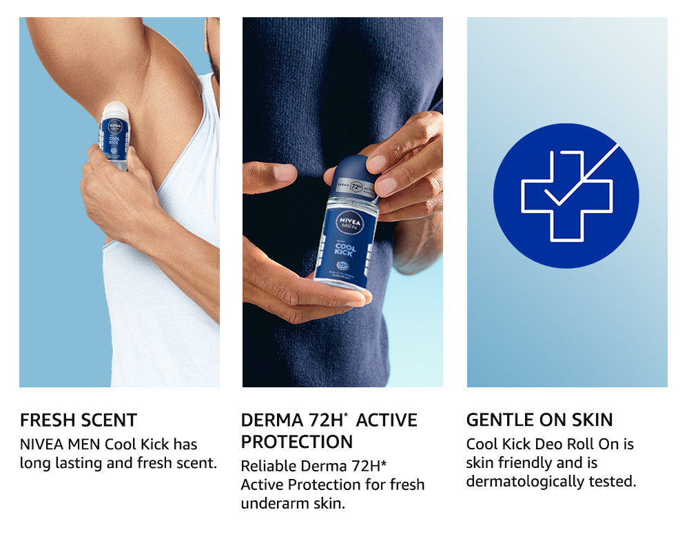 NIVEA MEN Cool Kick Deodorant for Men instantly offers a great feeling of vitalising freshness while it protects reliably all day long. The mild Cool-Care formula vitalises the body pleasantly and regulates transpiration effectively. NIVEA MEN Cool Kick Deodorant for Men has a stimulating scent which provides long-lasting fresh feeling. At NIVEA, we have a vast selection of products including soaps, shower gels, bath additives, deodorants, creams, lotions, and milks to help improve the healthy look and glow of your skin. Discover the ideal NIVEA product for your needs and preferences - we cater to both men and women with a range of personal hygiene products.