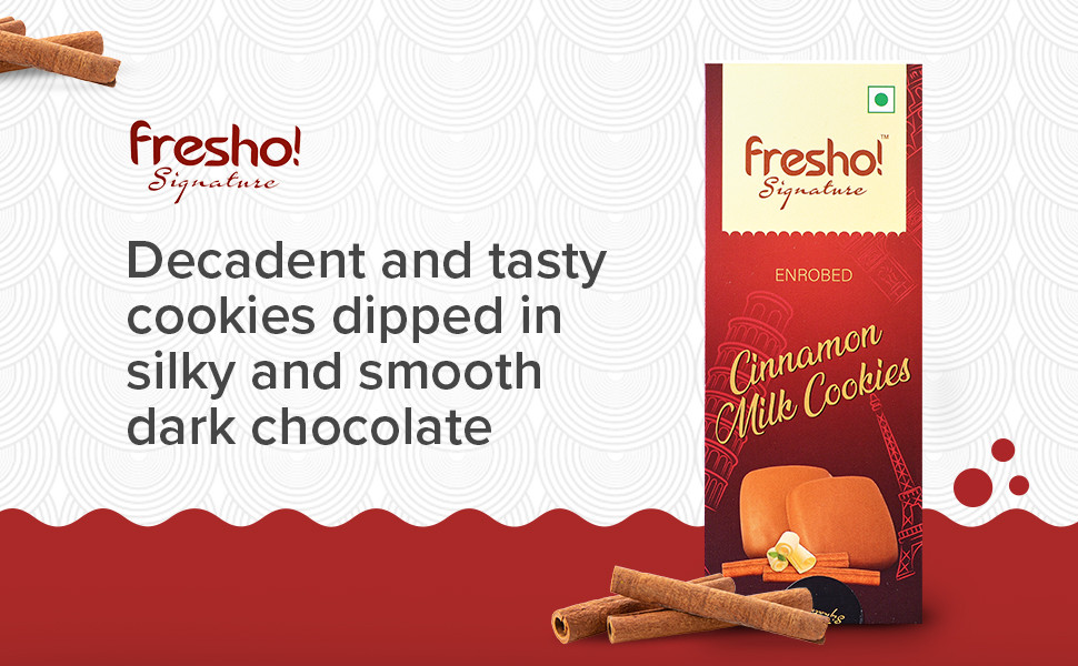 About the productExperience the rich and delicious cookies dipped in silky and smooth dark chocolate by Fresho Signature. Crisp, all-rounded coated cookies baked with sweet cinnamon and enrobed with chocolate. They offer a burst of flavours with the cinnamon and chocolate combination. These sweet treats are best enjoyed on their own, paired with a warmed beverage, or as an ingredient in your favourite dessert. Fresho Signature is an artisanal bakery brand, led by expert chefs who use top-of-the-line ingredients with their authentic recipes and bring forth premier bakery products.