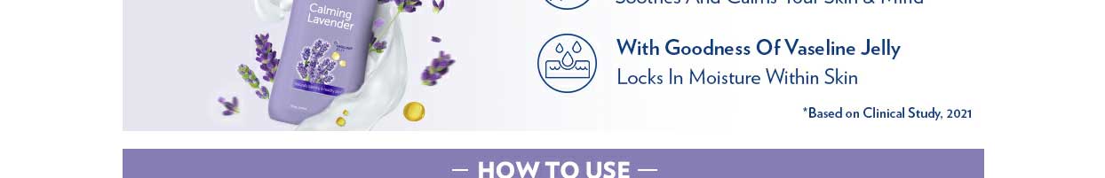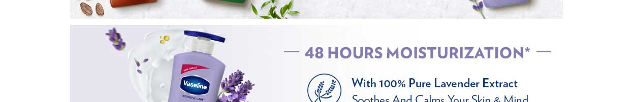Looking after the health of your skin is of utmost importance because extra effort always shows, even on your skin. That's why you should pay extra attention to what you choose for your skin. Presenting New Vaseline Calming Lavender Body Lotion, specially formulated with 100% Pure Lavender extract and extra goodness of Vaseline jelly, which gives your skin that little extra to keep it glowing and ready for anything. This body lotion calms dry irritated skin for naturally glowing, naturally healthy skin* (*refers to moisturisation in the cosmetic domain). Its non-greasy formula conditions your skin while soothing your senses with a non-greasy feel. Also, its clinically proven formula keeps your skin moisturised for 48 Hours. Fragranced with lavender oil is known to help soothe and calm your mind by reducing anxiety. With a relaxing scent containing lavender oil, Vaseline Calming Lavender lotion goes deep into the skin leaving it soft, supple and pleasantly fragranced. Best suited for: dry skin, dull skin, rough skin.