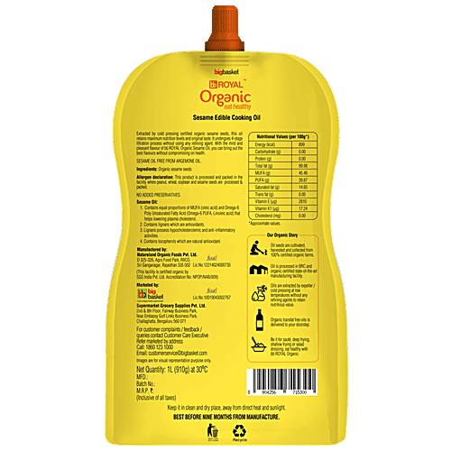 bb Royal Organic Cold Pressed Sesame/Gingelly Cooking Oil, 1 L Pouch
