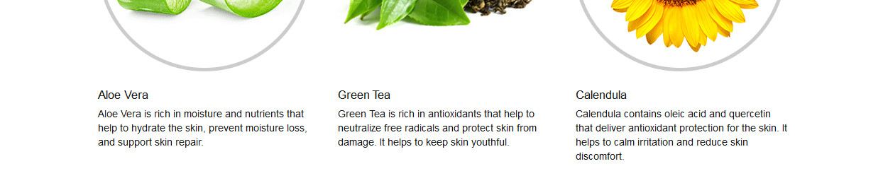Aloe Vera, Green Tea, Calendula, Cucumber, Hyaluronic Acid.