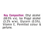 Ethyl alcohol (66.5% w/w), Iso Propyl alcohol (3.2% w/w), Glycerin (0.5%), Vitamin E, Permitted Colour & Perfume.