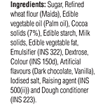 Refined Wheat Flour (Maida), Sugar, Edible Vegetable Oil, Edible Starch, Cocoa Solids (2%), Edible Vegetable Fat, Skimmed Milk Powder, Edible Common Salt, Emulsifier (E322), Raising Agent [E500(ii)], Dough Conditioner (E223). Contains Permitted Synthetic Food Colour (E150d) And Added Artificial Flavours (Dark Chocolate, Vanilla).