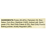Potato, Palmolein Oil, Rice Flakes, Corn Flour, Stabilizer, Iodized Salt, Garlic Paste, Red Chilly Flakes, Red Chilly Powder, Baking Powder, Acidity Regulator.