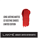 Introducing the new Lakme Absolute Limited Edition Mattes – a range of matte lipsticks with vibrant shades, available for a limited time only. This season, say goodbye to boring and celebrate with 12 exciting shades that let your lips speak for you! Designed by experts, this lipstick leaves you with a lightweight feel and a matte finish.