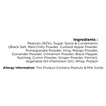 Peanuts(82%), Sugar, Spice & Condiments (Black Salt, Red Chilly Powder, Custard Apple Powder, Pomegranate Powder, Hing, Mango Powder, Coriander Powder, Cinnamon Powder, Black Pepper, Nutmeg, Cumin Powder, Ginger Powder, Fennel), Vegetable Oil (Palmolein Oil), Whey Protein