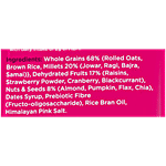 Whole Grains 68% {Rolled Oats, Brown Rice, Millets 20% (Jowar, Ragi, Bajra, Samai)}, Dehydrated Fruits 17% (Raisins, Strawberry Powder, Cranberry, Blackcurrant), Nuts & Seeds 8% (Almond, Pumpkin, Flax, Chia), Dates Syrup, Natural Prebiotic Fibre (Fructooligosaccharide), Rice Bran Oil, Himalayan Pink Salt.