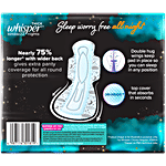 Whisper Bindazzz Nights ensures upto 0% leaks all night long. Whisper Bindazzz Nights pad is 75% longer and has a wider back so you are stay protected from leaks on all sides.