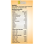 Nutrition per gram/ml: 100g Serving Size: 4-5 Teaspoons a Day Energy: 899.1 Kcal Total fat: 99.9 g Saturated Fat: 93.7 g Monounsaturated Fat: 5.3 g Polyunsaturated Fat: 0.9 g Trans Fat: 0 g Cholesterol: 0 mg Sodium: 0.2 mg Total carbohydrate: 0 g Sugar: 0 g Protein: 0 g Vitamin A: 0 mcg Vitamin C: 0 mcg Calcium: 0 mg Iron: 0.1 mg Caproic - C6: 0.18% Caprylic - C8: 7.02% Capric - C10: 6.12% Lauric - CI2: 49.6% Myristic - CI4: 19.83% Palmitic - C16: 7.81% Stearic-C18: 3.12% Oleic - C18: 1: 5.3% Linoleic - CI9:2: 0.93%