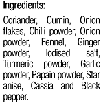 Coriander, Chillies, Cumin, Cassia, Fennel, Black Pepper, Cloves, Turmeric, Cardamom, Garlic, Dried Mango, Bay Leaves, Ginger, Star Anise, Trifla, Mace, Iodised Salt.