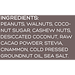 Organic Peanuts, Organic Walnuts, Organic Coconut Sugar, Organic Cashew Nuts, Natural Desiccated Coconut, Raw Cacao Powder, Organic Stevia, Organic Cinnamon, Organic Cold Pressed Groundnut Oil, Sea Salt