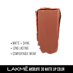 The new Lakmé Absolute 3D Matte Lip Color helps you add a new dimension to your lips! It is matte with a hint of shine, for glamorous lips with added dimension. Available in 12 stunning shades that range from peachy pinks to deep plums and intense maroons to everyday nudes, it is the perfect collection to help bring out your many dimensions. Experience rich colour payoff in a single stroke. Its long-lasting formula will keep your lips looking glamorous all day. Express your many dimensions with the new Lakmé Absolute 3D Matte Lip Color Range. Make a bold statement every day with a long-lasting, intense colour payoff that is the perfect addition to your makeup routine. Give your lips the definition it needs and experience the future of lip colour with the new range of Lakmé Absolute 3D Lip Color. Pick your favourite Lakmé Absolute 3D Lip Color shade today!